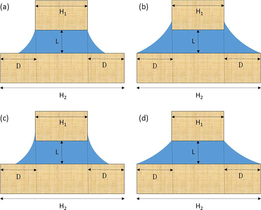 Pro každý z těchto stavů jsou odvozeny Kelvinovy rovnice, které určují podmínky vzniku kondenzace v závislosti na geometrii systému a smáčivosti stěn. Výsledné fázové diagramy odhalují dva zásadní organizační mechanismy: (i) geometrický separátor při poměru délek stěn D = L, který rozděluje kondenzační režimy, a (ii) mez fázového přechodu “wedge filling” při kontaktním úhlu θ = π/4; pod touto mezí jsou možné všechny čtyři typy kondenzace, zatímco nad ní zůstávají možné pouze dva. Získané výsledky mají význam nejen z hlediska fundamentální fyziky fázového rozhraní, ale i pro aplikace v mikrofluidice, porézních materiálech a nanoelektromechanických systémech, kde kapilární efekty a uspořádání menisků hrají klíčovou roli.